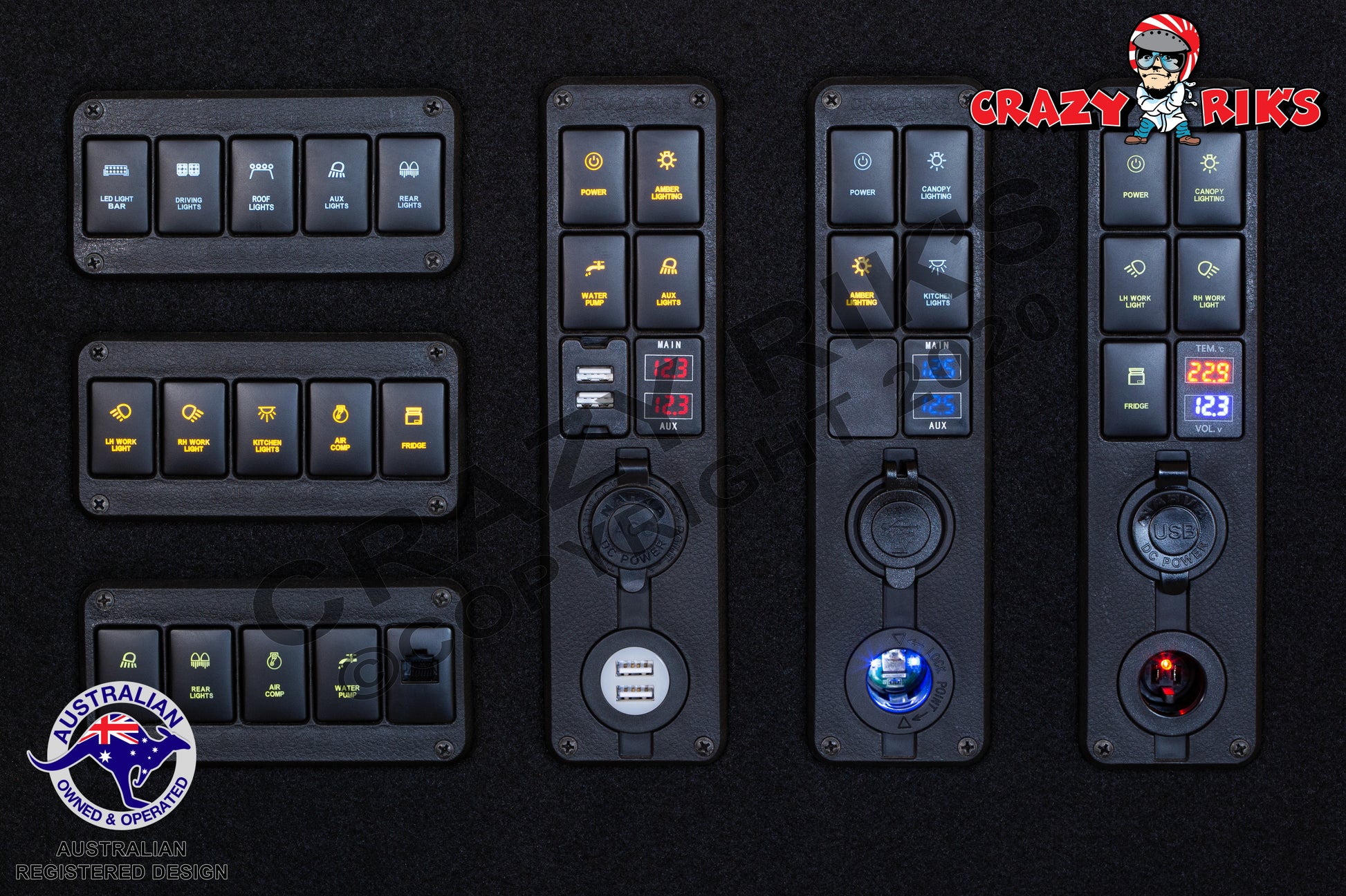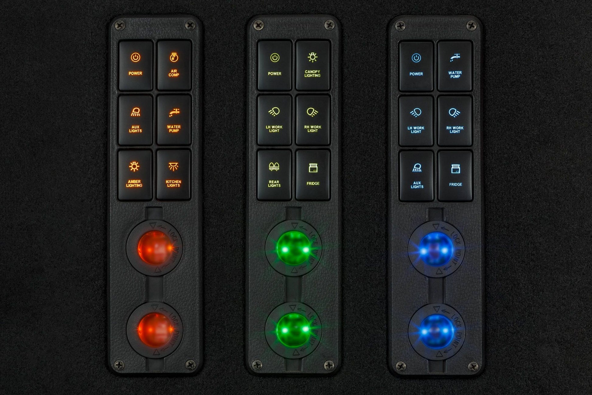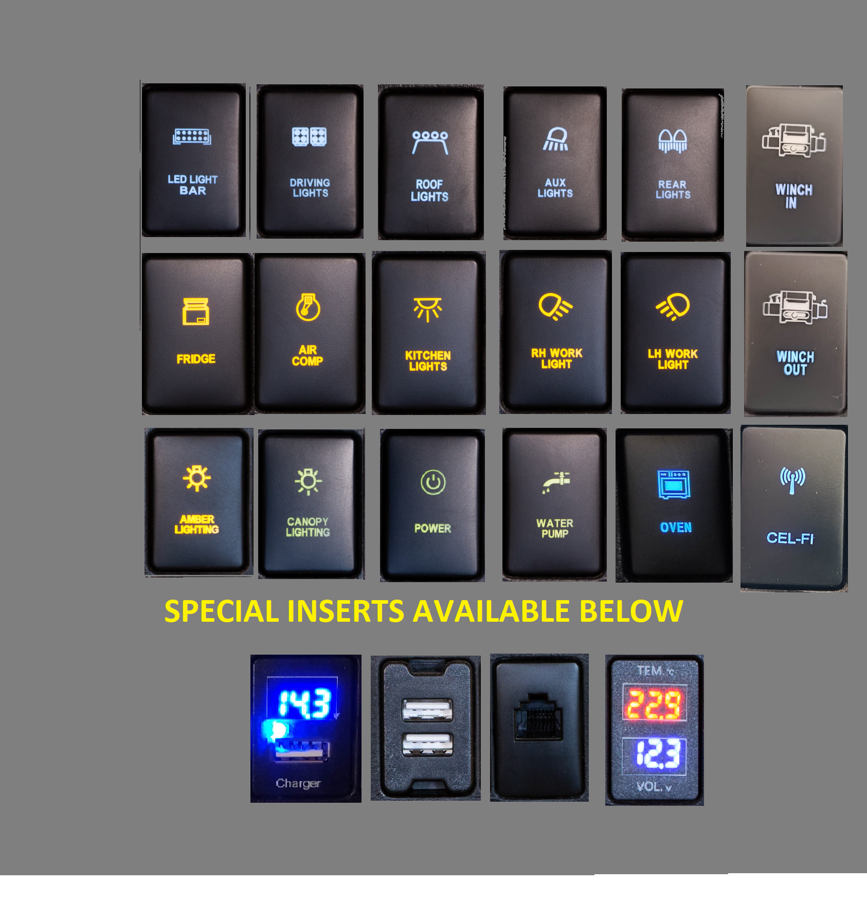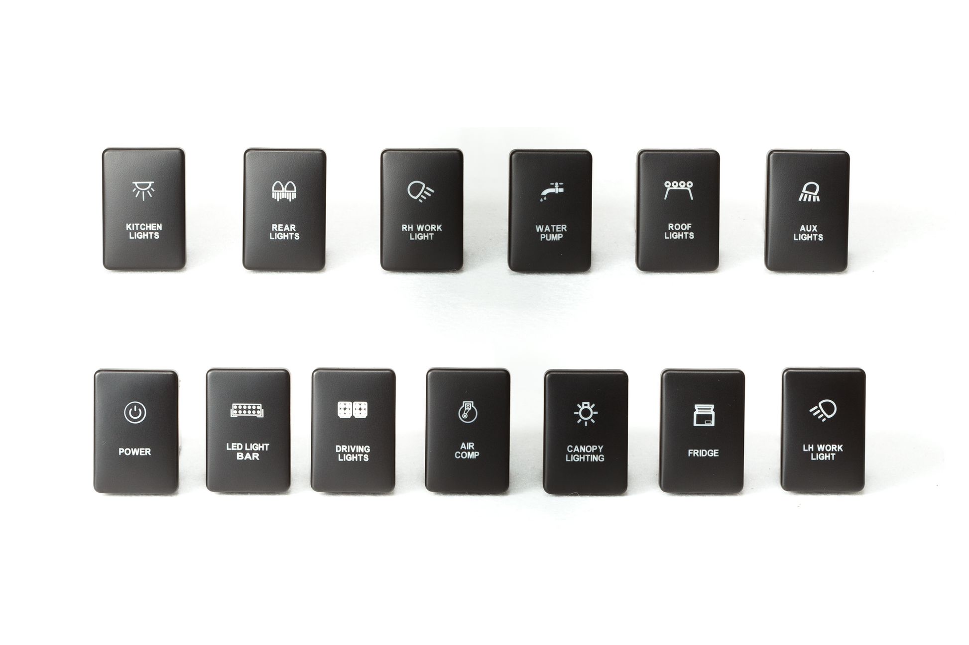Our full range of switches are designed for our canopy and drawer wing panels as well as our 200 Series Landcruiser dash replacement panels.